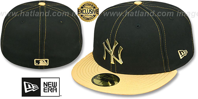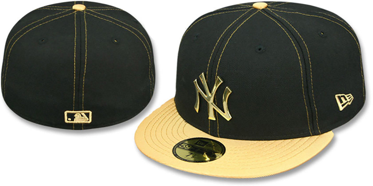 Authentic and ORIGINAL 59Fifty wool fitted hat by New Era, black deep crown and metallic gold dazzle visor, light grey undervisor, gold chrome metal team logo attached to front, matching embroidered New Era logo on side, matching raised embroidered MLB logo on back . This New York Yankees hat is made by New Era and is licensed by the MLB - Major League Baseball.