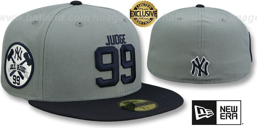 Authentic and ORIGINAL 59FIFTY poly fitted hat by New Era, storm (medium) grey authentic poly deep crown and navy blue visor, raised embroidered JUDGE 99 logo on front in navy, XL side-patch Aaron Judge ALL RISE embroidery on side, embroidered New Era logo on opposite side, matching embroidered team logo on back . This New York Yankees baseball cap is made by New Era and is licensed by the MLB - Major League Baseball.