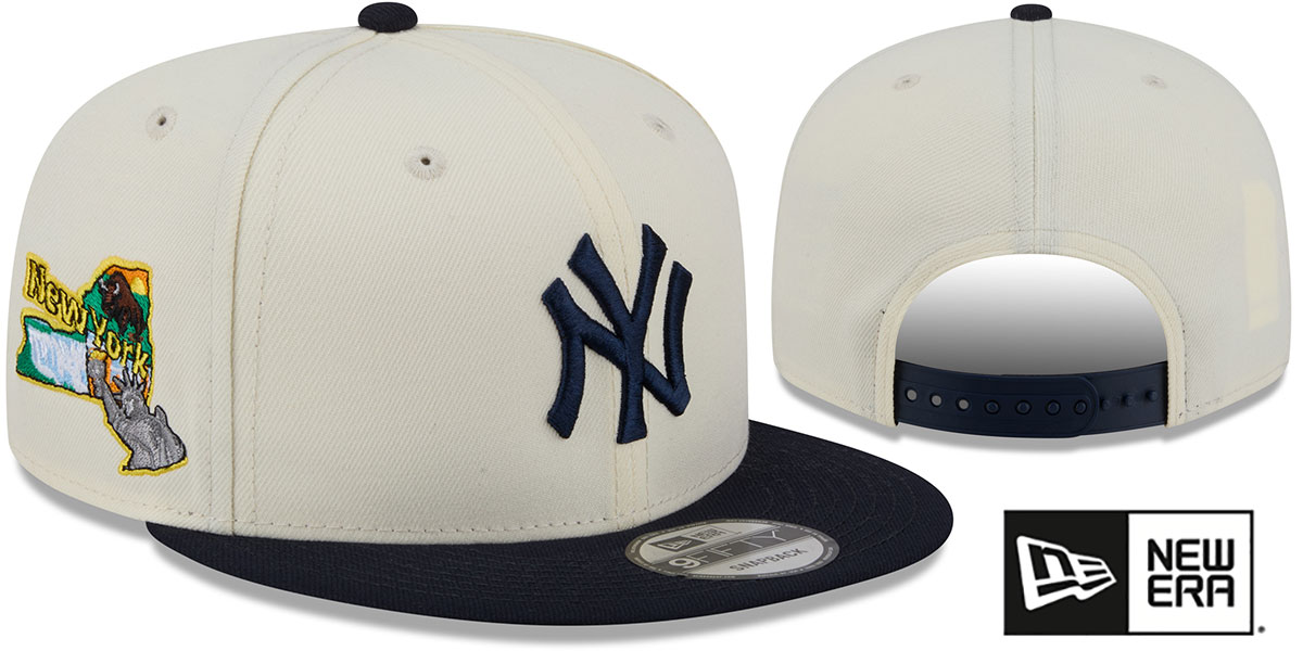 Original 9FIFTY adjustable poly hat by New Era that has similar deep crown and flat brim fit as the 59-Fifty, chrome (cream off white) crown with navy blue visor, kelly green undervisor, raised embroidered team logo on front in team color, embroidered New Era logo on side, embroidered Localized New York state logo on side, team color adjustable Snapback closure. This New York Yankees hat is made by New Era and is licensed by the MLB - Major League Baseball.