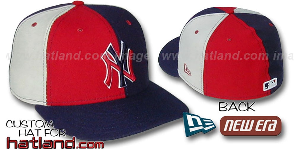 'Authentic' New Era ORIGINAL 59FIFTY fitted hat, red-navy blue-stone(off white) alternating panels on deep crown with navy visor, raised embroidered team logo on front and matching 'MLB' logo on back. This item is on SALE!. This New York Yankees baseball cap is made by New Era and is licensed by the MLB - Major League Baseball.