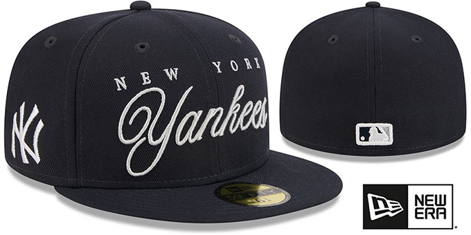 Authentic and ORIGINAL 59Fifty fitted hat by New Era, navy blue authentic poly deep crown and visor, light grey undervisor, embroidered team city on front over raised embroidered script team name, embroidered team logo on side with raised emabroidered MLB logo on back. This New York Yankees hat is made by New Era and is licensed by the MLB - Major League Baseball.
