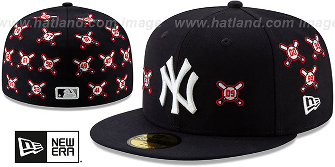 Authentic and ORIGINAL 59FIFTY fitted hat by New Era, team color navy blue wool deep crown and visor, throwback kelly green undervisor, raised embroidered NY team logo on front, baseballs with years winning the World Series and crossed bats embroidered All-Over deep crown and visor, embroidered MLB logo on back. This New York Yankees baseball cap is made by New Era and is licensed by the MLB - Major League Baseball.