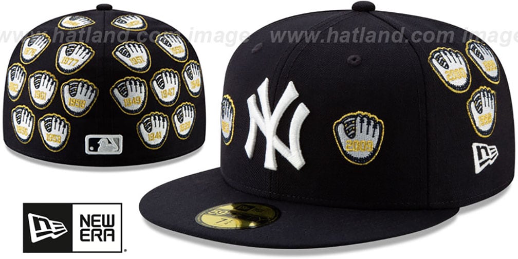 Authentic and ORIGINAL 59FIFTY fitted hat by New Era, team color navy blue wool deep crown and visor, throwback kelly green undervisor, raised embroidered NY team logo on front, baseball gloves in white and navy with metallic gold outline and with years winning the World Series in metallic gold embroidered All-Over deep crown and visor, embroidered MLB logo on back. This New York Yankees baseball cap is made by New Era and is licensed by the MLB - Major League Baseball.