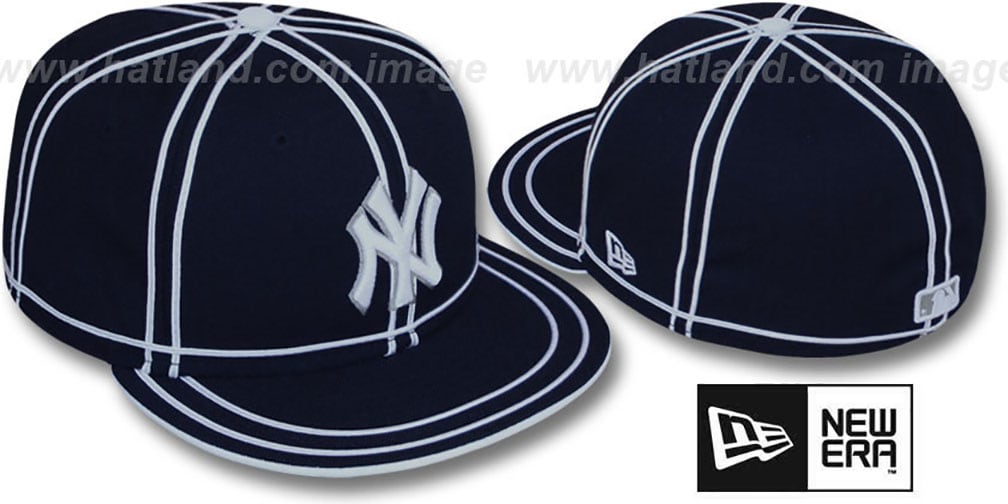 'Authentic' and ORIGINAL 59FIFTY fitted hat by New Era, navy blue deep crown and visor, white undervisor and flip, double red piping throughout deep crown and visor, raised embroidered matching team logo on front, embroidered MLB logo on back. This New York Yankees baseball cap is made by New Era and is licensed by the MLB - Major League Baseball.
