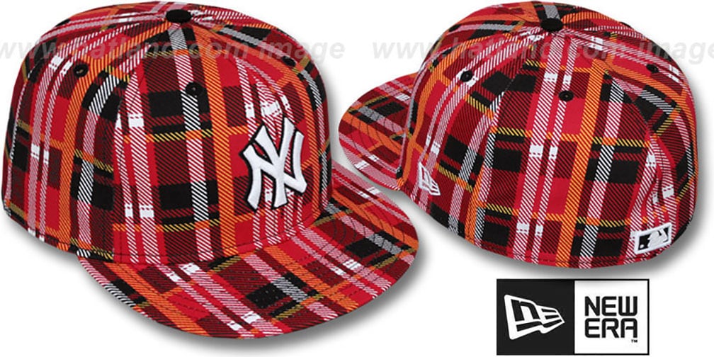 'Authentic' and Original 59FIFTY fitted hat by New Era, red-black-orange-gold-white cotton twill printed plaid deep crown and visor, black undervisor, white raised embroidered team logo on front with black outline, matching MLB logo on back. This New York Yankees baseball cap is made by New Era and is licensed by the MLB - Major League Baseball.