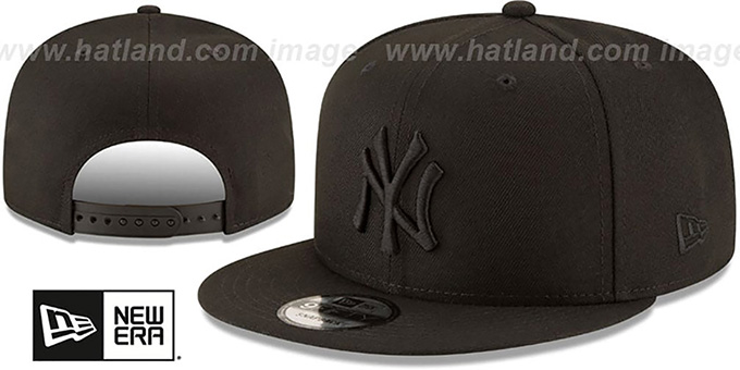 Original fit 9FIFTY adjustable authentic poly hat by New Era that has similar deep crown and flat brim fit as the 59-Fifty, black crown and visor, light grey undervisor, raised embroidered team logo on front in all black, black embroidered New Era flag on side, black adjustable Snapback strap closure . This New York Yankees hat is made by New Era and is licensed by the MLB - Major League Baseball.