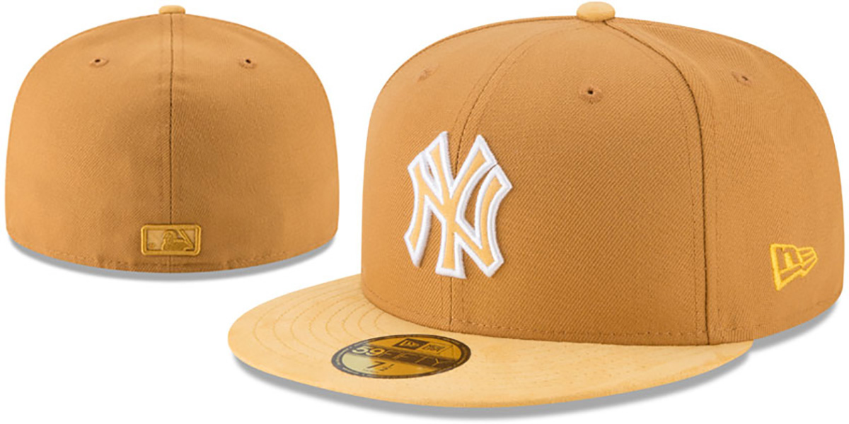 Authentic and ORIGINAL 59FIFTY fitted hat by New Era, panama tan (wheat) authentic poly deep crown and gold faux SUEDE visor and button, panama tan undervisor, raised embroidered team logo outline on front in white with matching faux suede fill, New Era logo embroidered on side, matching MLB logo on back. This New York Yankees baseball cap is made by New Era and is licensed by the MLB - Major League Baseball.