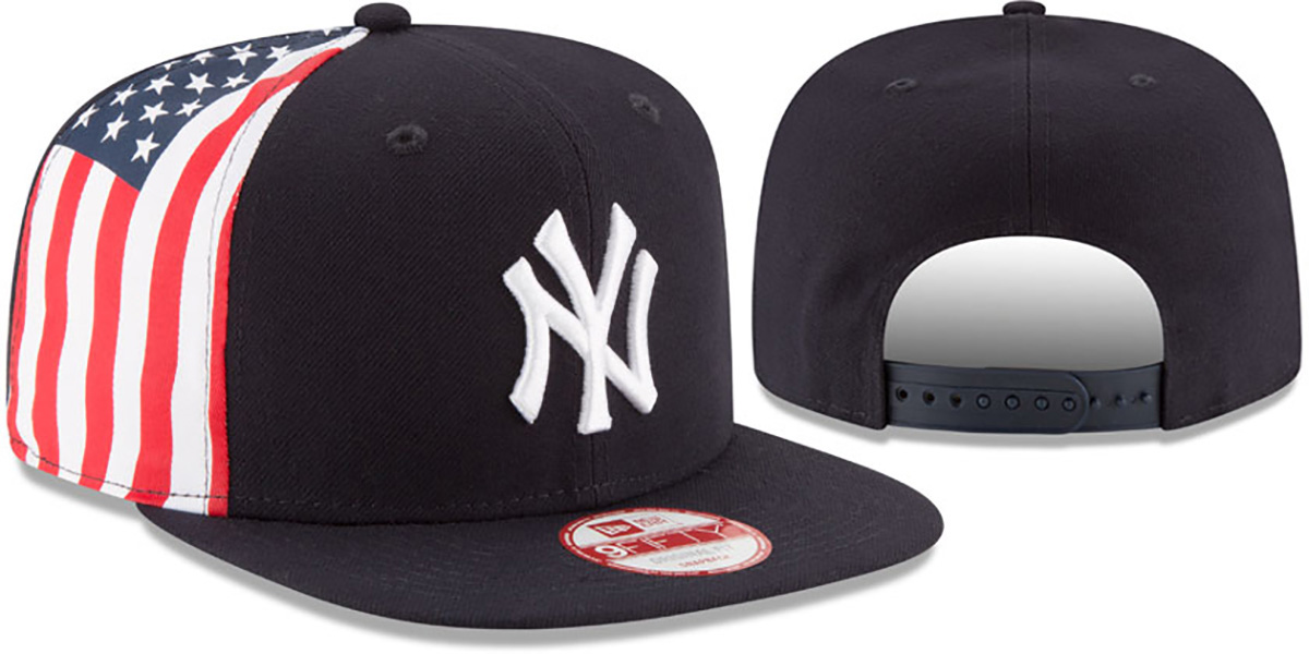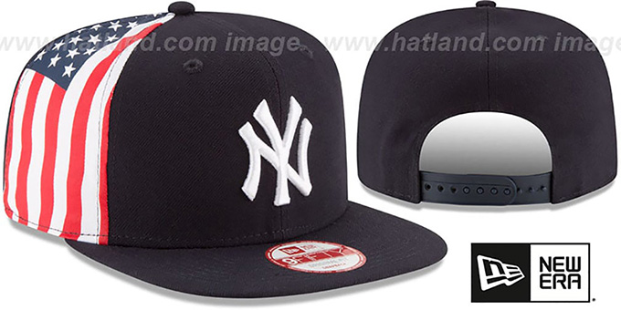 Original fit 9-FIFTY adjustable hat by New Era that has similar deep crown and flat brim fit as the 59-Fifty, navy blue crown and visor with light grey undervisor, raised embroidered team logo on front, red-white-blue USA flag print on side panel, New Era flag on opposite side, matching adjustable Snapback strap. This New York Yankees hat is made by New Era and is licensed by the MLB - Major League Baseball.