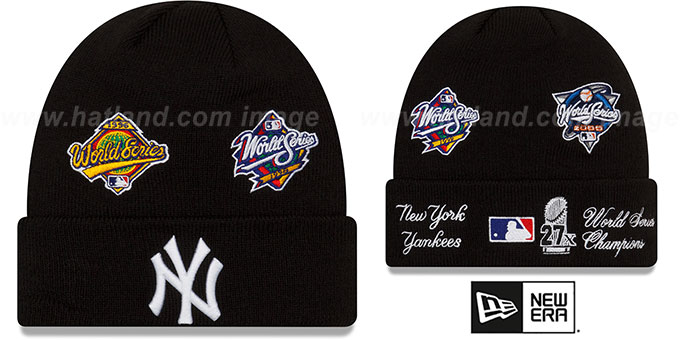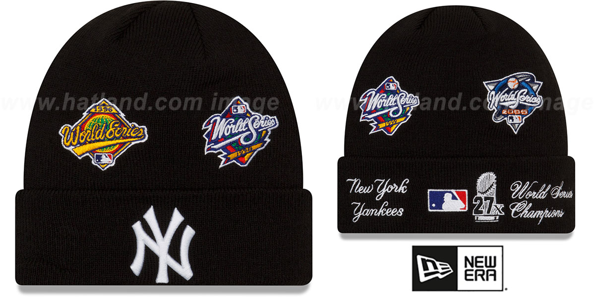 black acrylic knit beanie with with cuff, raised embroidered team logo on front of cuff, embroidered official World Series logos around crown from the years winning the MLB Championship, embroidered New Era Flag on side of cuff, embroidered team name and 27X World Series Champions script on back with embroidered MLB logo on back cuff. This New York Yankees hat is made by New Era and is licensed by the MLB - Major League Baseball.