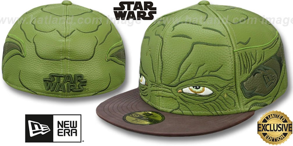 Authentic and ORIGINAL 59Fifty fitted hat by New Era, green polyurethane faux leather crackledf deep crown and brown visor, brown undervisor, Yoda embroidery around deep crown on all panels, Hi-Res printed nylon lining with All-Over Yoda images, STAR WARS raised embroidery on back in matching green, Officially licensed Star Wars hat produced Exclusively by New Era for HATLAND.COM Collector's Item: Limited Edition release for the new Star Wars movies. This Star Wars hat is made by New Era.